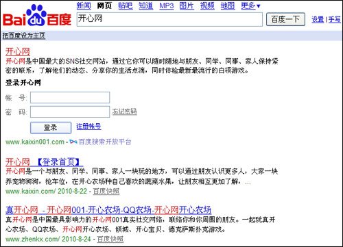 百度中輸入關(guān)鍵字“開心網(wǎng)”3個字,令人驚奇的是